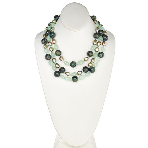 Prehnite Jasper and Golden Pearls Three Row Necklace