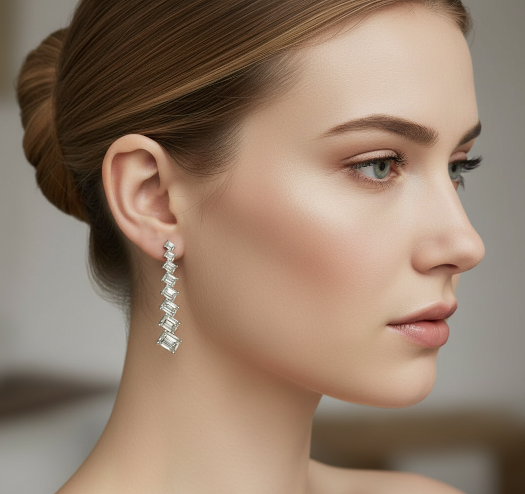 Indulge in pure luxury with our Emerald Cut Diamond Line Long Earrings. These exquisite earrings feature emerald cut diamonds that are sure to elevate any outfit. Expertly designed and set with precision. These earrings are the perfect accessory for any sophisticated and elegant look.