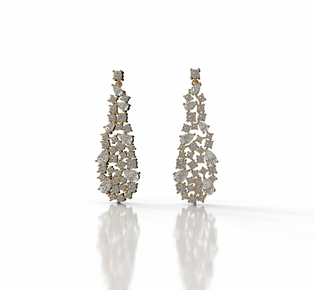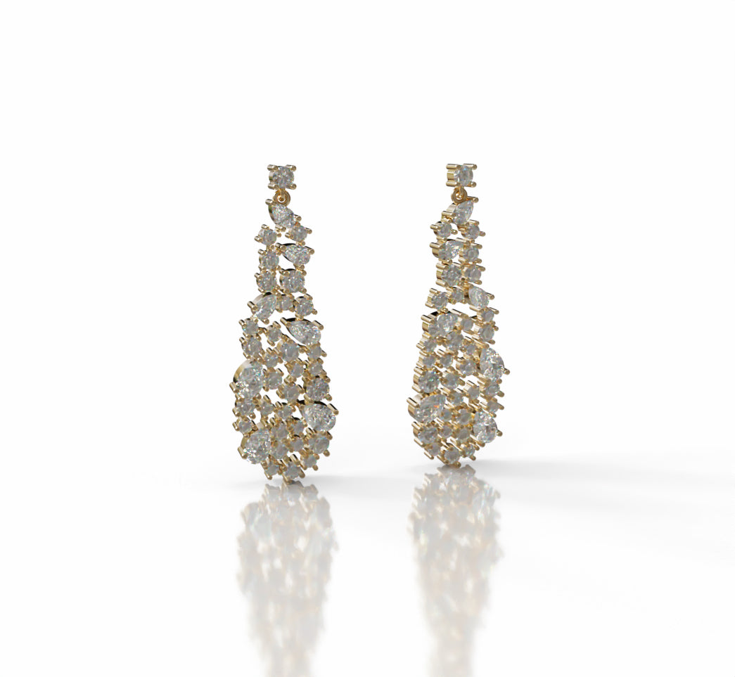 Discover refined elegance with these stunning cluster drop earrings, showcasing a carefully curated arrangement of pear-shaped and round diamonds. The contrasting facet patterns create a luminous display of brilliance, while the graceful drop design adds movement and sophistication to any ensemble.