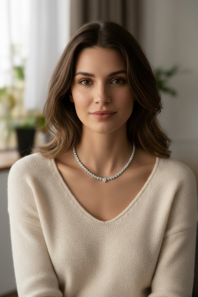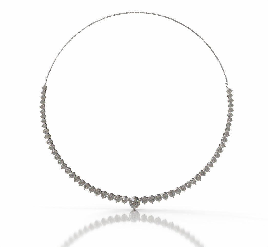 A refined tennis necklace showcasing 18.0 carats of lab-grown round diamonds set in elegant tapered three-prong settings. Versatile enough for evening occasions or everyday luxury, this piece commands attention with its brilliant sparkle and timeless design.