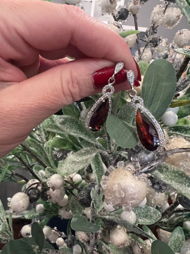 Sterling silver with CZ Pave posts and CZ Pave around the ruby pear drops